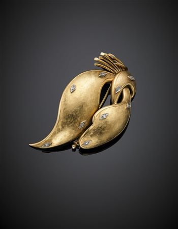 Yellow chased gold and platinum stylized leaf brooch accented with diamonds, g 19.10 circa, length cm 6 circa.