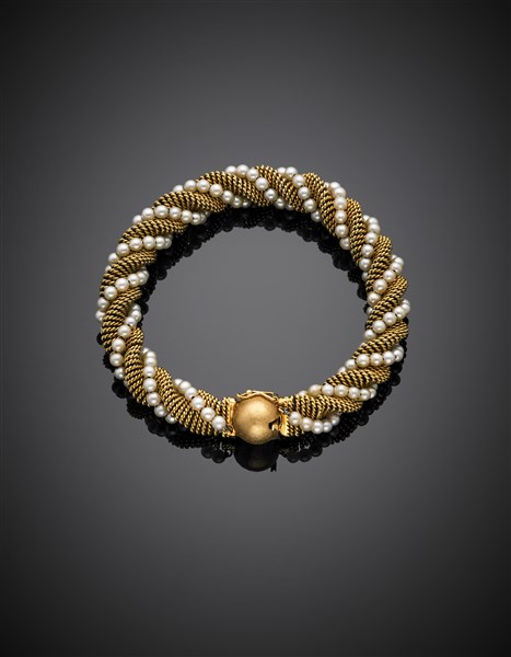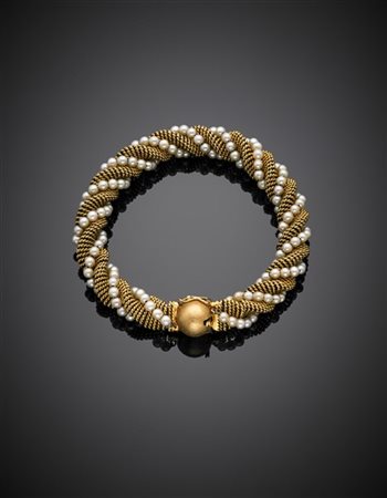 Yellow gold rope and cultured pearl torchon bracelet, g 55.60 circa, length cm 21.40 circa. Marked 101 TO. (slight defects)