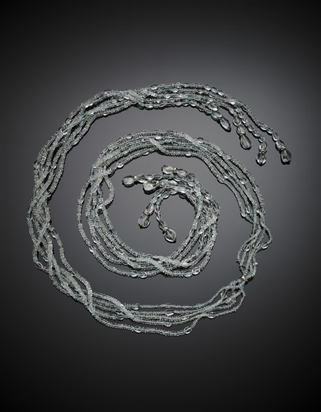 Collier multifili in boules sfaccettate di acquamarina rifinito in oro bianco, g 204,70 circa, lungh. cm 133 circa. Firmato e marcato Orlandi, 1773 MI.