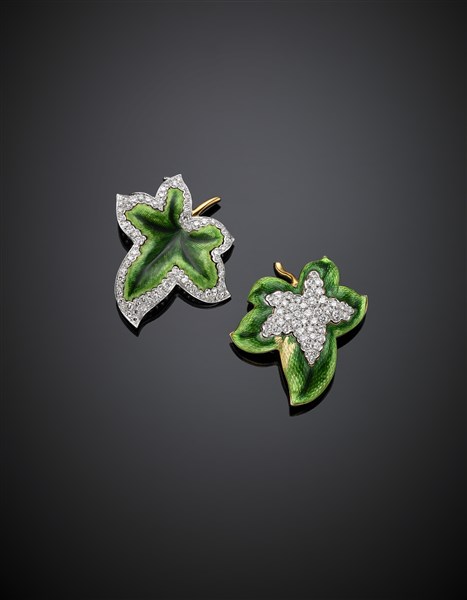 Pair of bi-coloured gold diamond and green enamel brooches, diamonds in all ct. 2.40 circa, in all g 25.50 circa, length cm 4 circa. Marked 26 AL. (defects)