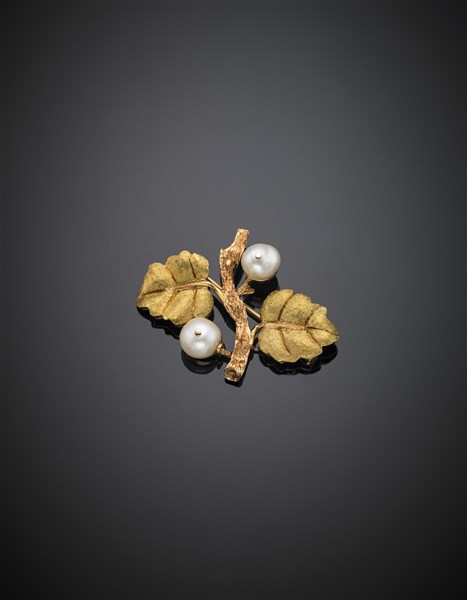 Broche floreale in oro giallo e rosa cesellato con due perle coltivate di mm 6,80 - 7,70 circa, g 9,80 circa, lungh. cm 3,90 circa. Marcato 60 MI con il Fascio.