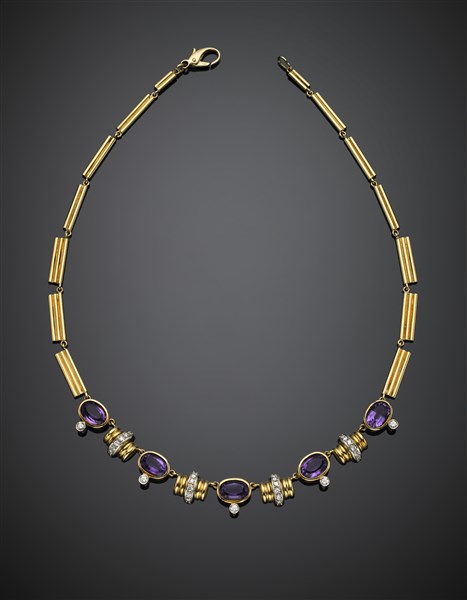 Collier articolato in oro giallo e bianco rifinito con diamanti e ametiste, g 45,40 circa, lungh. cm 41,50 circa.