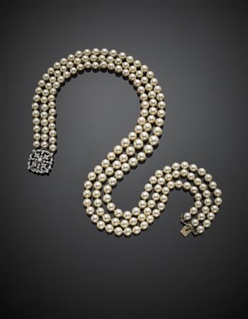 Three strand graduated cultured pearl necklace with white gold diamond clasp, pearl diam. from mm 6.80 to mm 9.75 circa, in all ct. 0.60 circa, g 121 circa, length cm 50.50 circa.