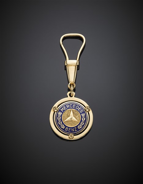 Portachiavi in oro giallo con stemma Mercedes Benz, g 30,70 circa, lungh. cm 7,70 circa. Firmato Faraone. In scatola originale