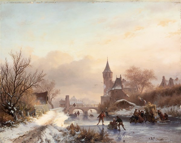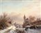 Jan Adam Jansz. Kruseman 1854"Paesaggio invernale con pattinatori" olio su tavola (cm 27,5x34
