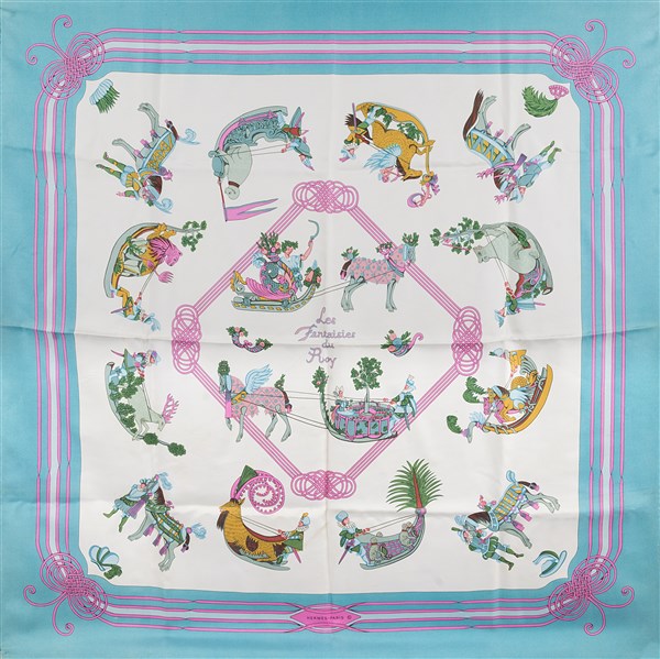 HERMÈS Foulard in seta "Les Fantaisies du Roy", Annie Faivre 1986, fondo bianc