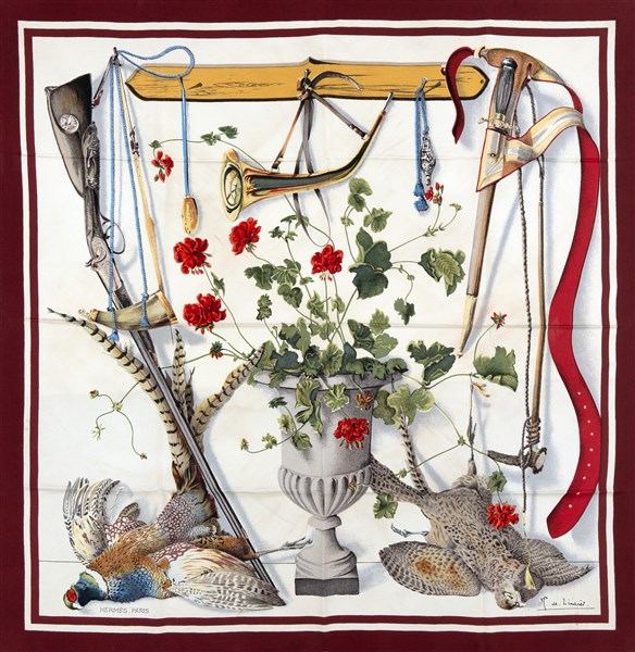 HERMÈS Foulard in seta "Fleurs et Gibiers" Henri de Linarès 1962, fondo avorio