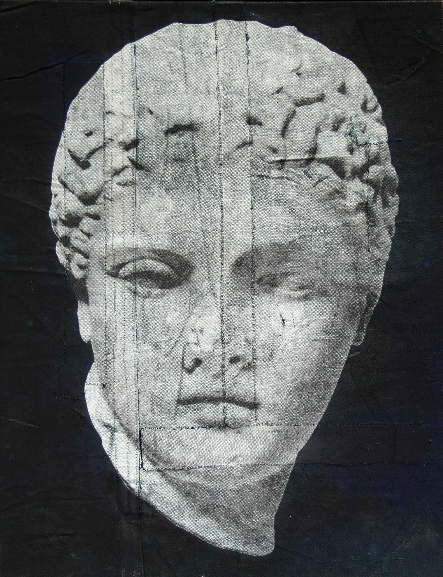 PIGNATELLI Luca, Testa femminile 2018 olio su telone di copertura di vagone ferroviario cm. 80 x 60, . Autentica dell'artista su fotografia in data 13/12/2019. Firma, luogo, data, titolo "Luca Pignatelli, Milano, 2018, Testa femminile" (al retro)