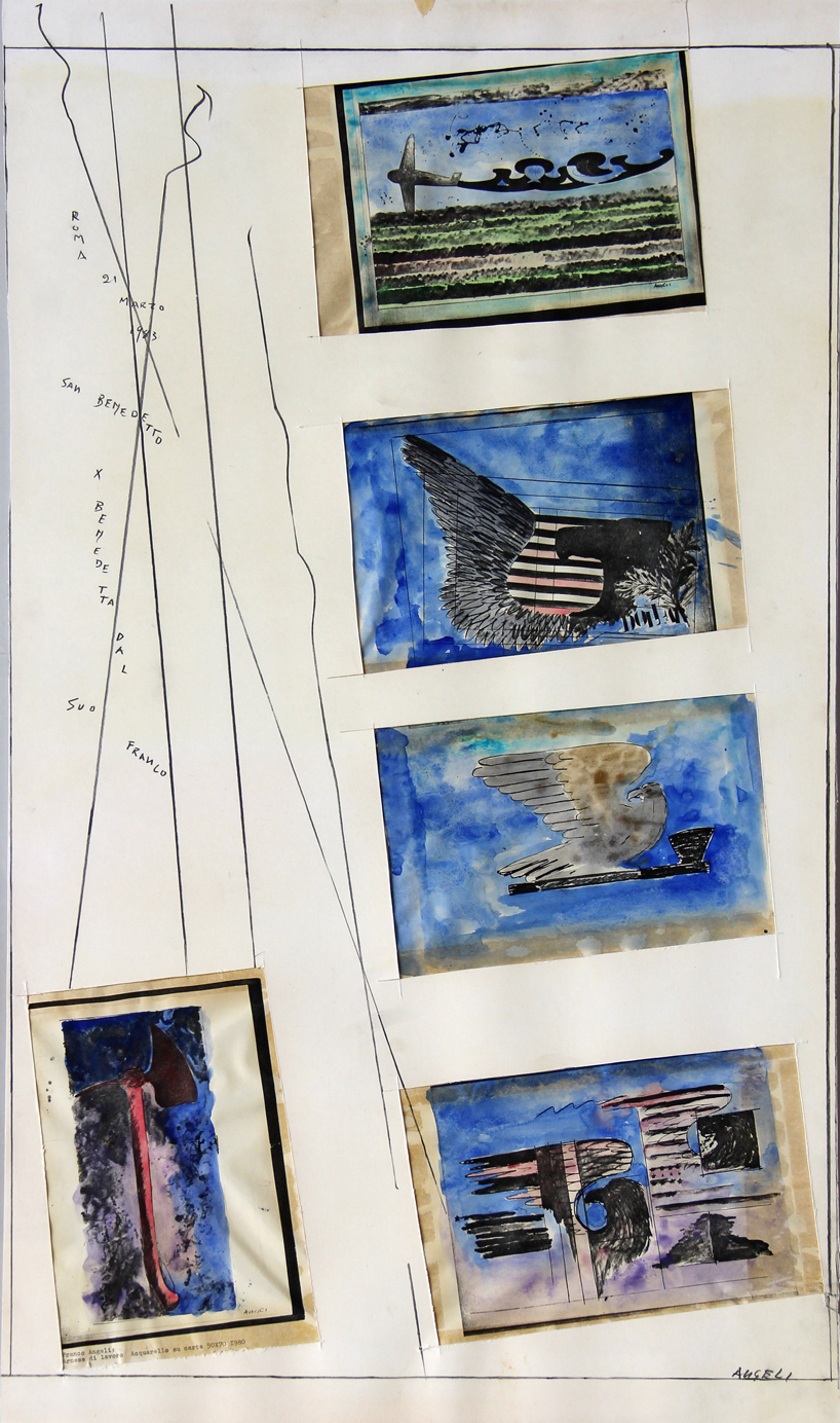 ANGELI Franco, Senza titolo 1983 collage, acquerello e matita su carta cm. 99 x 57, . Autentica rilasciata dall'Archivio Franco Angeli con n. P-221019/1581 in data 22/10/2019. Firma "Angeli" (in basso a destra)