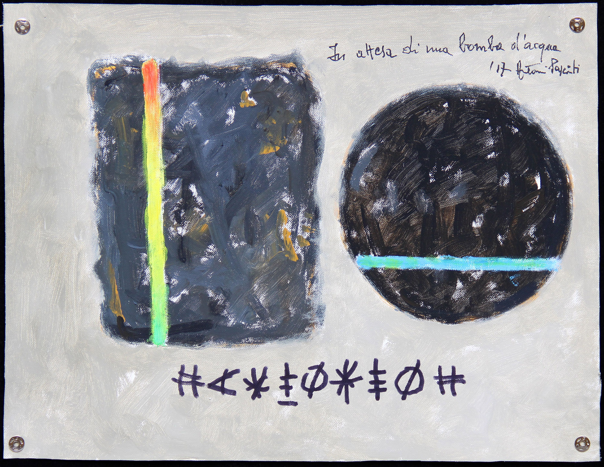 PASCIUTI Antonio, In attesa di una bomba d'acqua 2017 dipinto su tela cm. 35 x 46, . Autentica dell'artista su fotografia . Titolo, data, firma "In attesa di una bomba d'acqua, '17, Antonio Pasciuti" (in alto a destra)