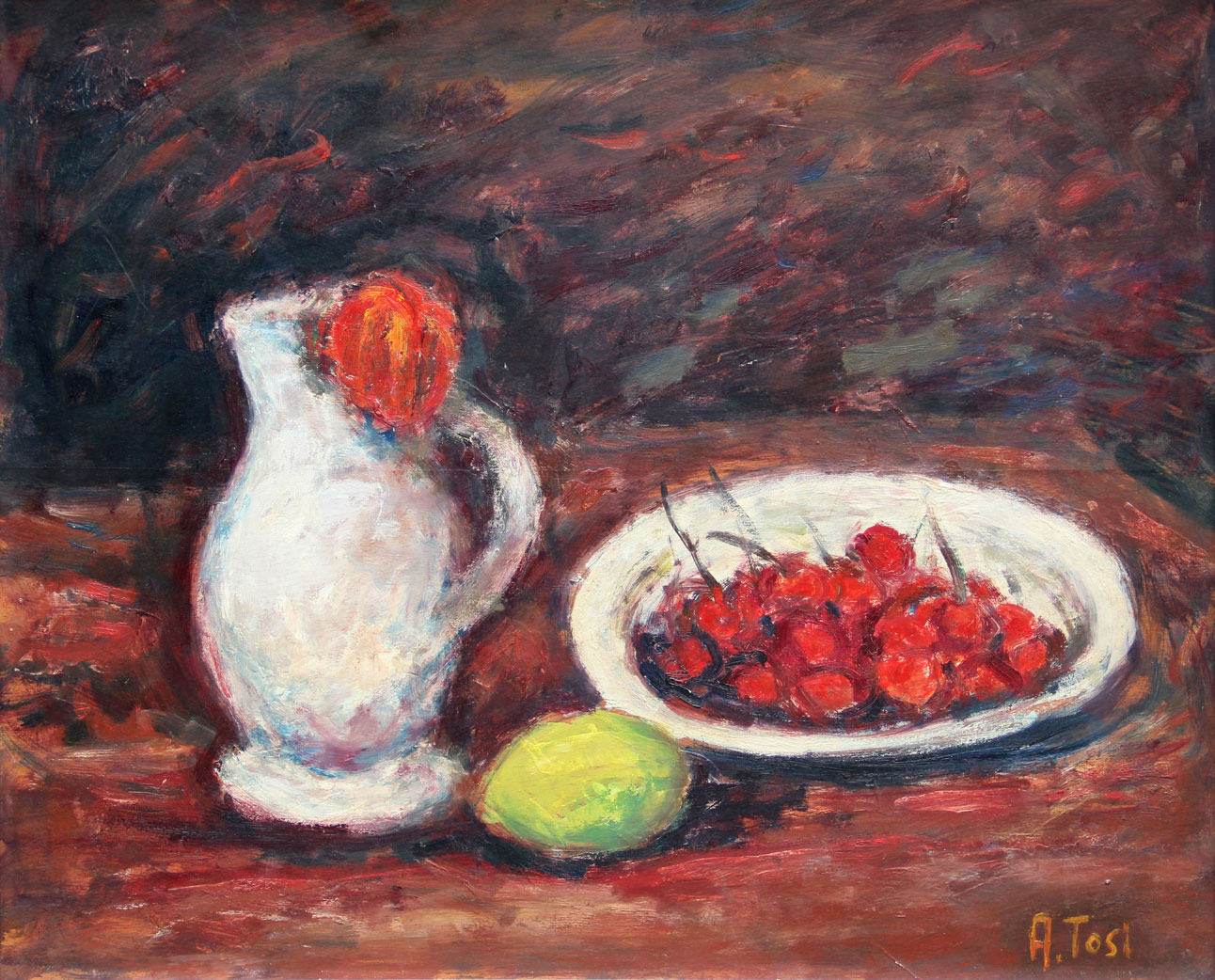 TOSI Arturo, Natura morta anni 50 (1950 - 1959) olio su tavola cm. 50 x 60, . Autentica a cura di Elena Pontiggia. Firma "A. Tosi" ((in basso a destra)