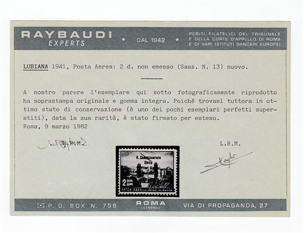 LUBIANA Occupazione italiana 1941 Posta aerea. 2d. grigio azzurro "R. Commissar