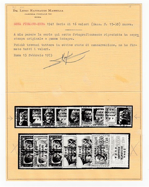 Serie completa di 10 valori "ZONA / OCCUPATA / FIUMANO / KUPA" e "ZOFK" ripetuto lungo la dentellatura orizzontale