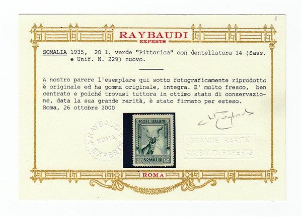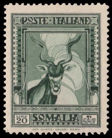 SOMALIA 1927 "Pittorica". 20 lire verde D.14 "Antilope Kundù" Cert. M. Raybaud