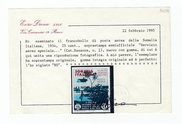 SOMALIA 1934 Posta aerea di servizio. 25c. indaco e bruno arancio soprastampato