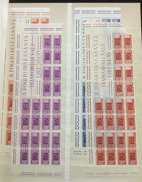 Insieme formato da blocchi angolari di cinque, quartine e singoli del periodo, compresi alcuni valori dei pacchi postali. Notata serie "Volta" in blocco angolare di cinque. In 2 classificatori e 1 raccoglitore. Da esaminare