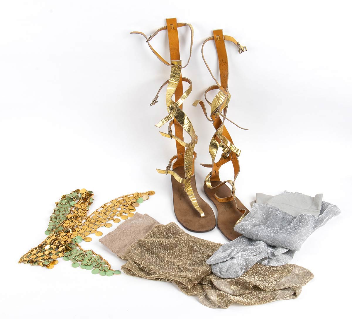 Lotto di articoli_: 2 paia di calze in lurex, cintura in metallo/plastica, sandali modello gladiatore Piper Market in pelle color oro, tg