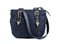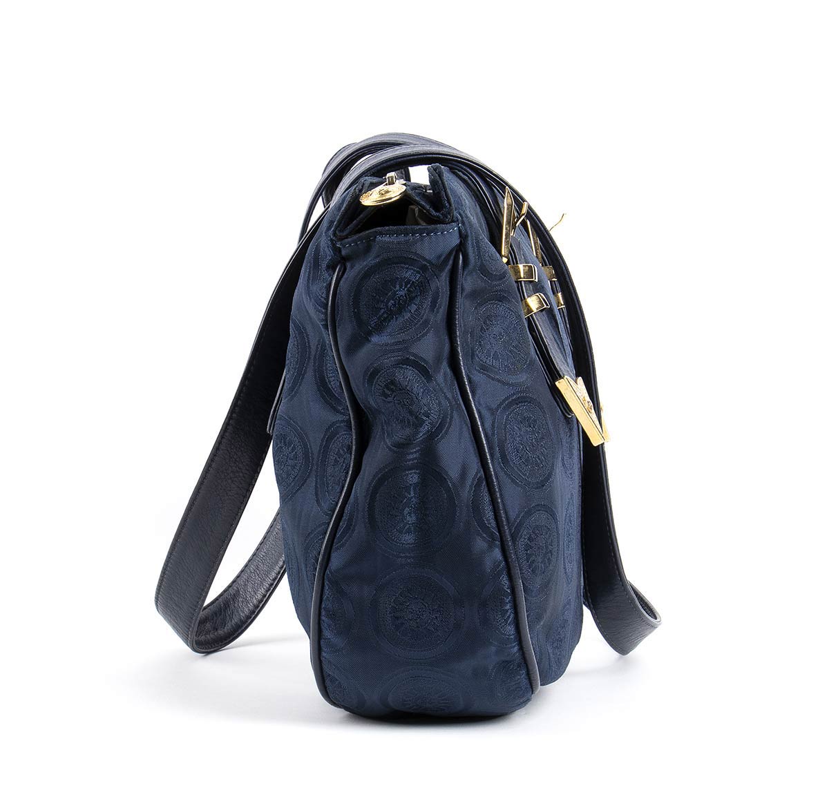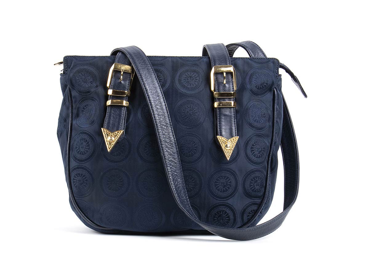 Borsa in tela blu scuro logata, manici in pelle, minuteria dorata.