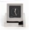 Orologio da viaggio in metallo argentato quadrante nero movimento al quarzo mod. 0830, dust bag e scatola originale.
