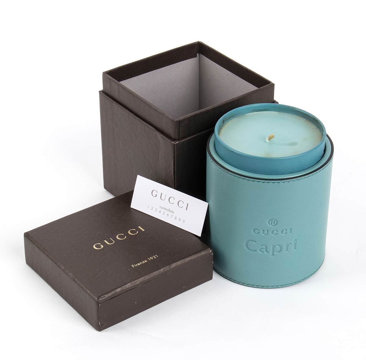 Candela contenitore in pelle turchese, scatola originale.