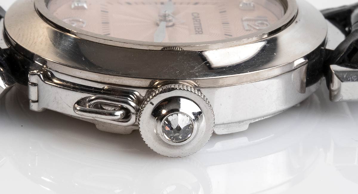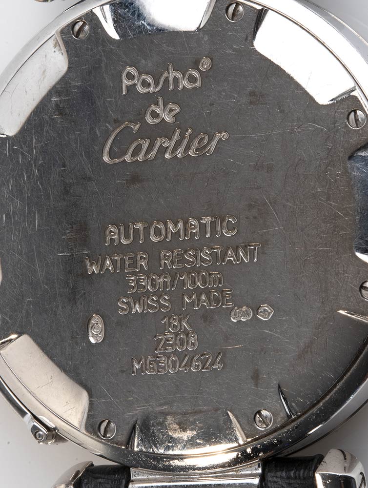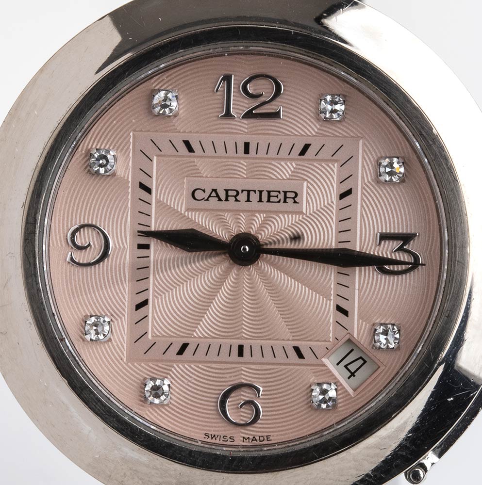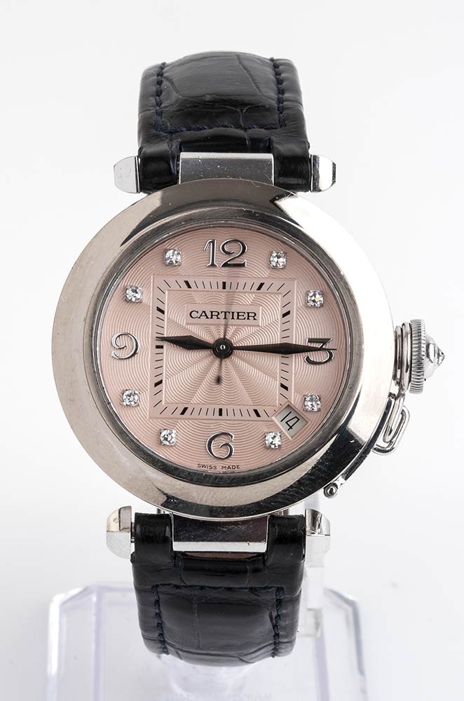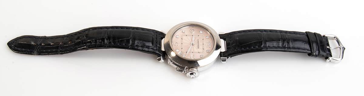 Bellisimo modello pasha con cassa e fibia in oro bianco 18kt e cinturino in pelle, datario e quadrante rosa con diamanti agli indici diametro 35mm numero referenza 2308