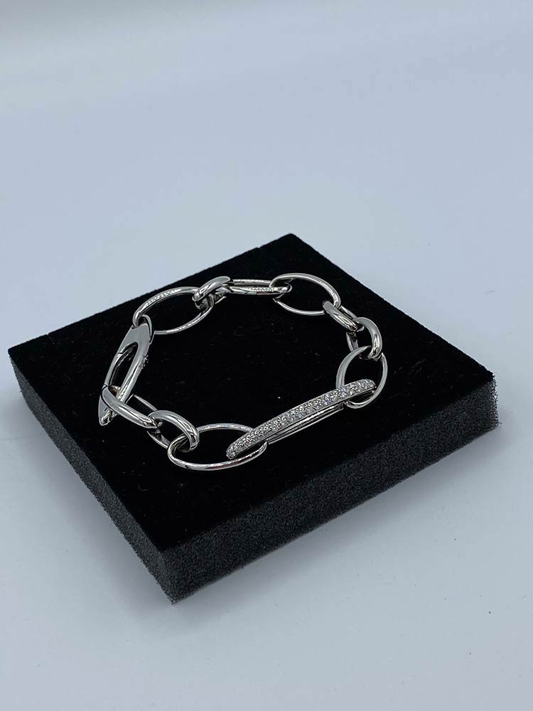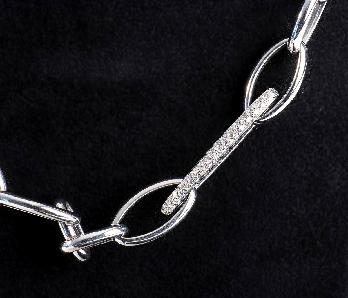 Parure firmata POMELLATO Collieur e Bracciale, collezzione ICONICA in oro bianco 18 Kt Peso Gr 162,54, catena a maglia ovale, con abilmente incastonati diamanti naturali Taglio Brillante per carati 2,54 F color VVS1. Chiiusura a scomparsa. Possibilità di unire i due monili e farne cosi una unica collana lunga Cm76.