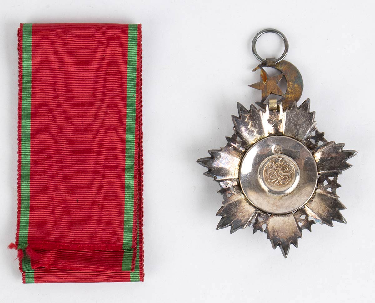 Insegna dell’ordine di Medidje, in oro, argnto esmalti, con nastro ottima fattura di fine XIX sec.