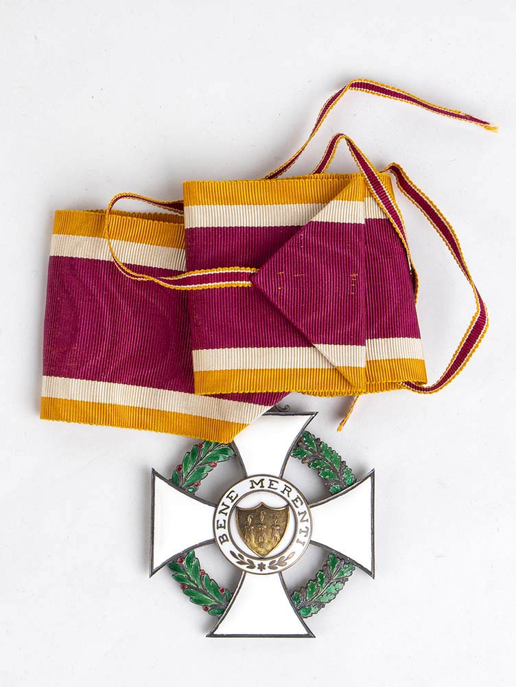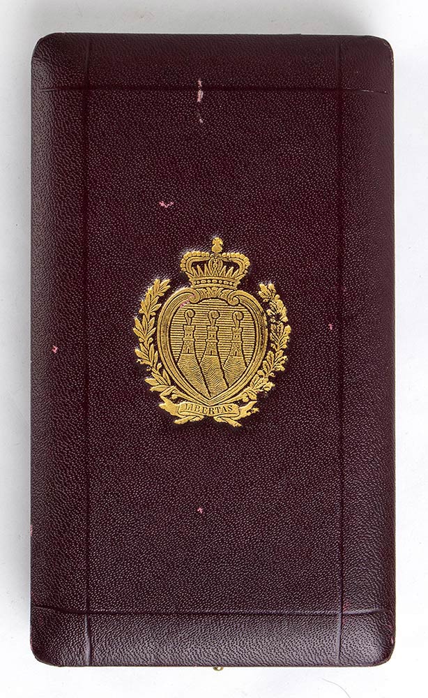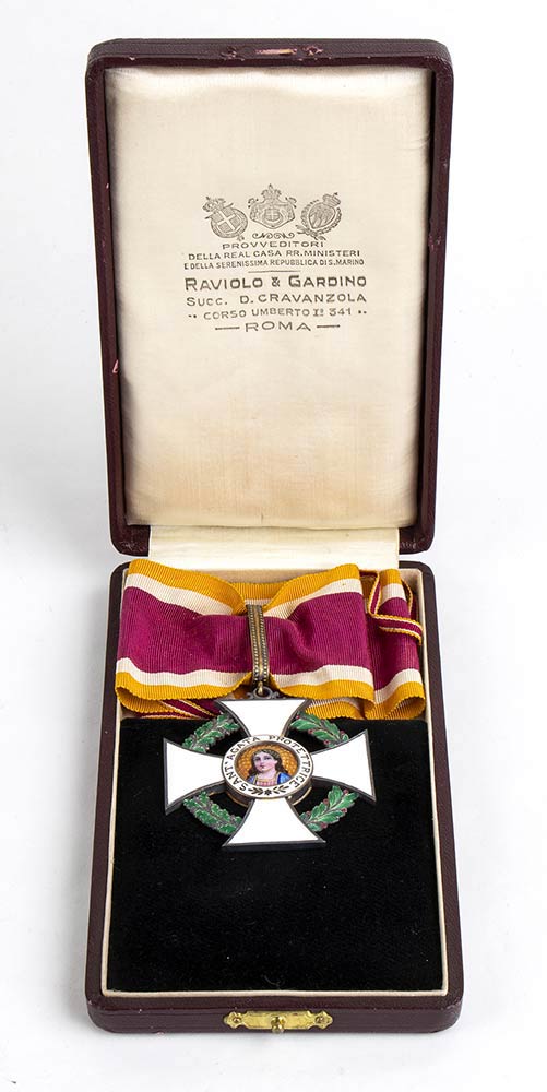 Insegna di commendatore dell’Ordine di Sant’Agata in astuccio, inusuale produzione di Raviolo e Gardino di inizi XX sec., molto raffinata. Rara di questa qualità.
