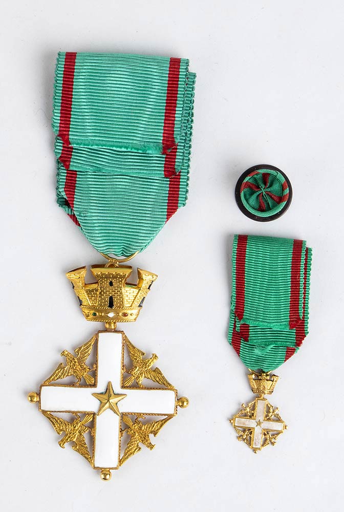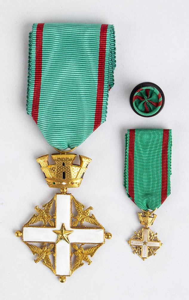 Bell’insegna in oro da cavaliere dell’ordine al merito, in astuccio con bottone e miniatura prodotta dalla ditta Alberti di Milano.