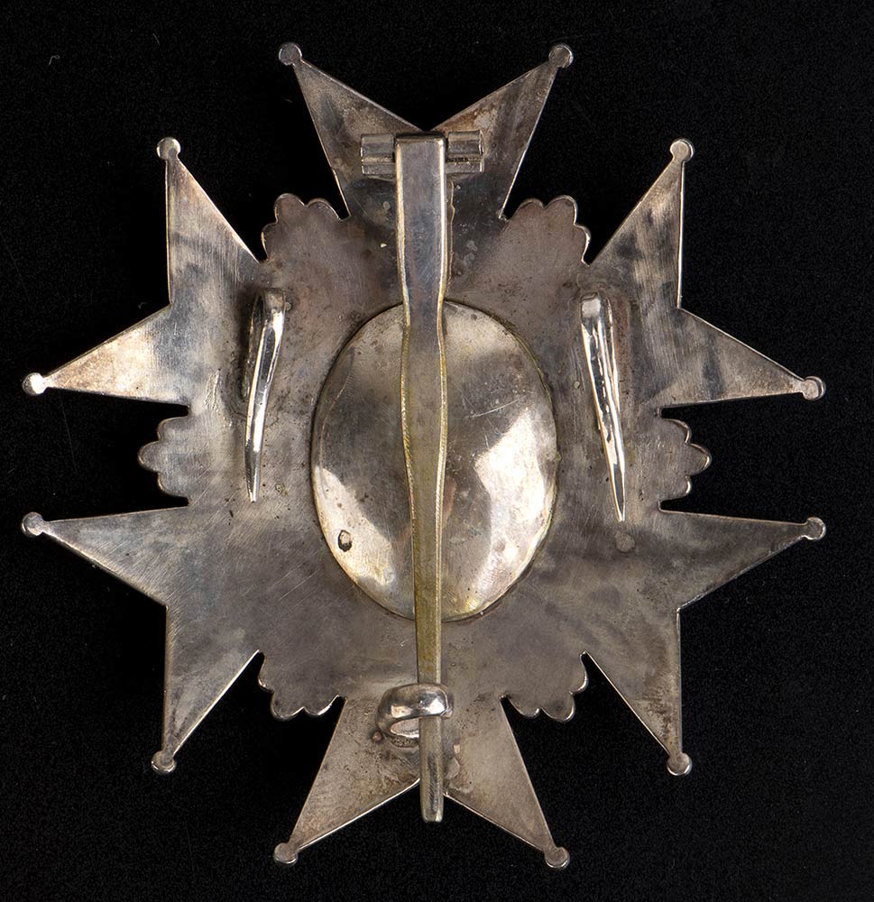 Bella placca di Cavaliere di Gran croce dell’Ordine di San Giuseppe, argento gettato e cesellato con al verso tripla spilla di sospensione a sezione piatta.