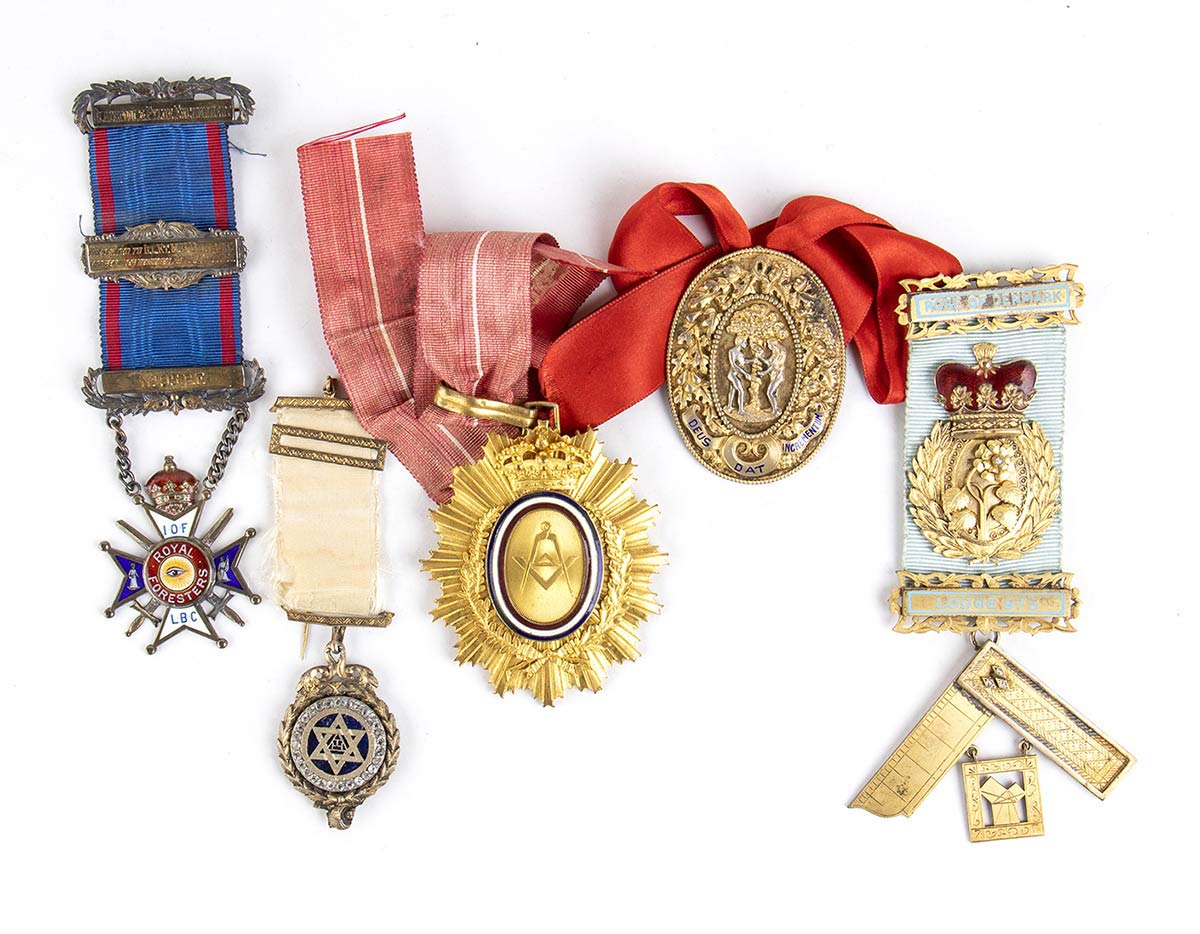Lotto di 5 medaglie massoniche in astuccio,3 di ottima fattura inglese di inizi XX sec. 2 di produzione tarda.