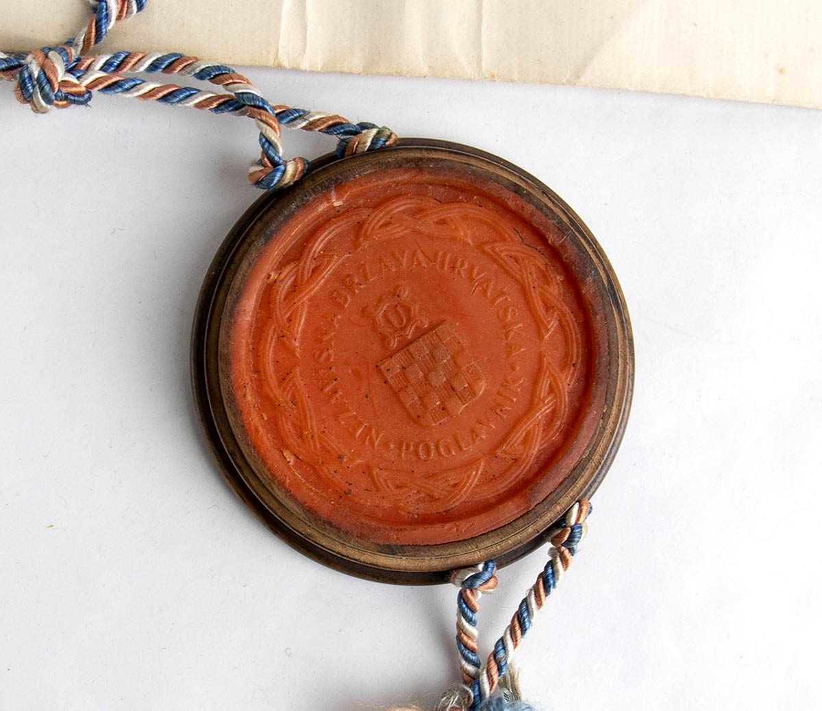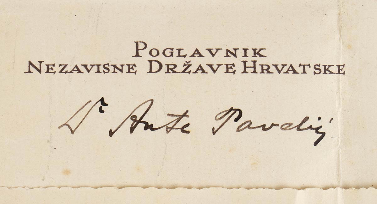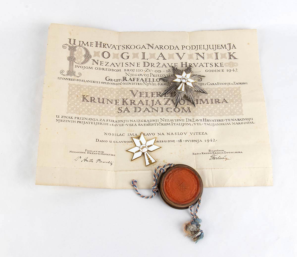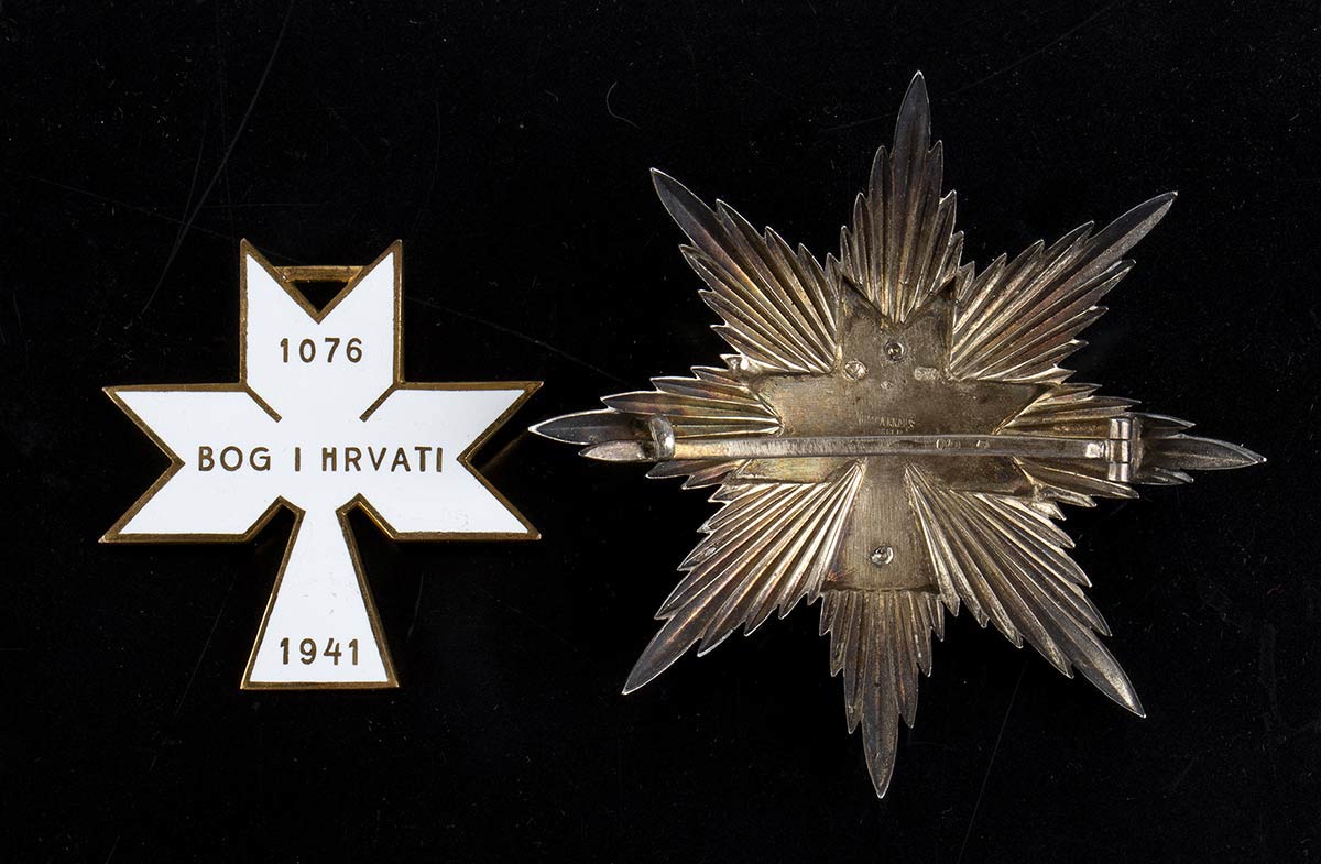 Bellissima placca con raggiera in argento stampato vuota al verso con marchi del fabbricante con applicata croce trifogliata caricata di corona croata, il pendente è senza l'anello di sospensione della fascia ma di ottima qualità e con gli smalti integri, il diploma di concessione ha il sigillo di stato croato in cera lacca e reca la firma autografa di Ante Pavelic, Ottimo stato, eccezionale insieme concesso a diplomatico italiano nel 1942