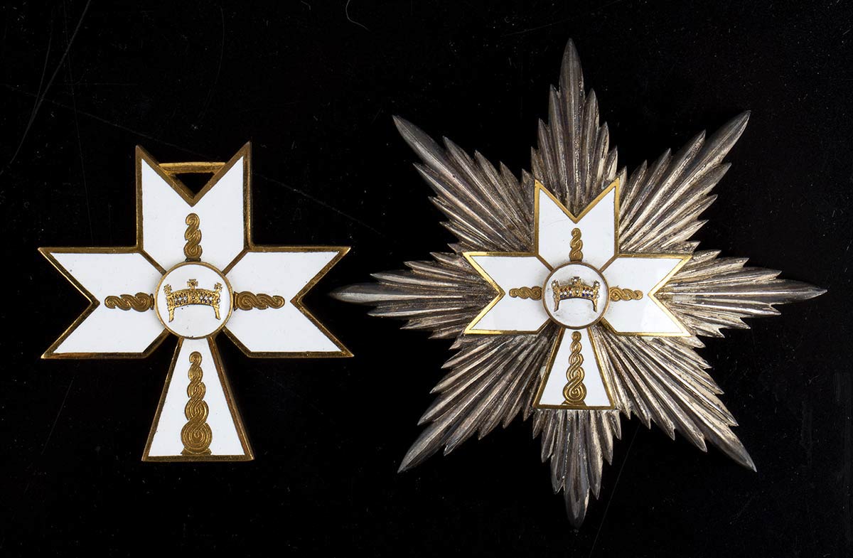Pendente e placca di Gran Croce per meriti civili con diploma di concessione ordini cavallereschi e medaglie. Argento, smalti, 95x95, 60x60