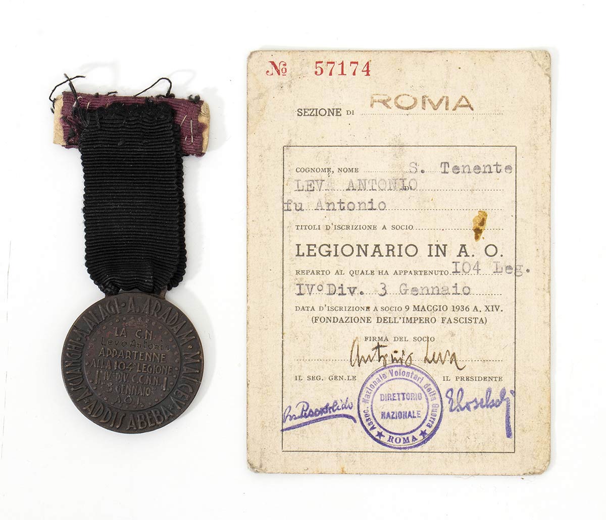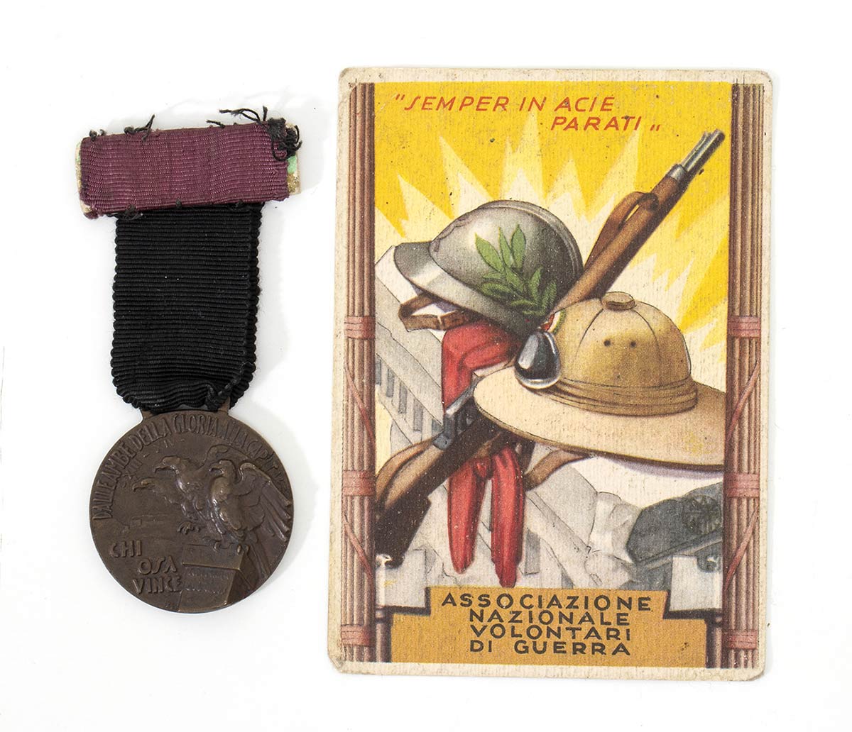 Medaglia in bronzo della divisione CCNN 3 Gennaio con nome del milite inciso al verso e tessera di riconoscimento del medesimo, insieme molto raro. Ottimo stato
