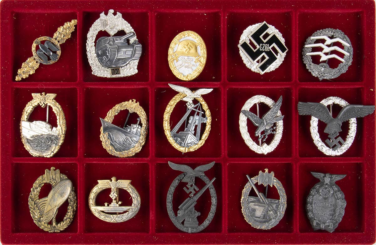 Lotto di 15 distintivi tedeschi del III Reich, copie di diverse qualuità, alcuni di vecchia fattura