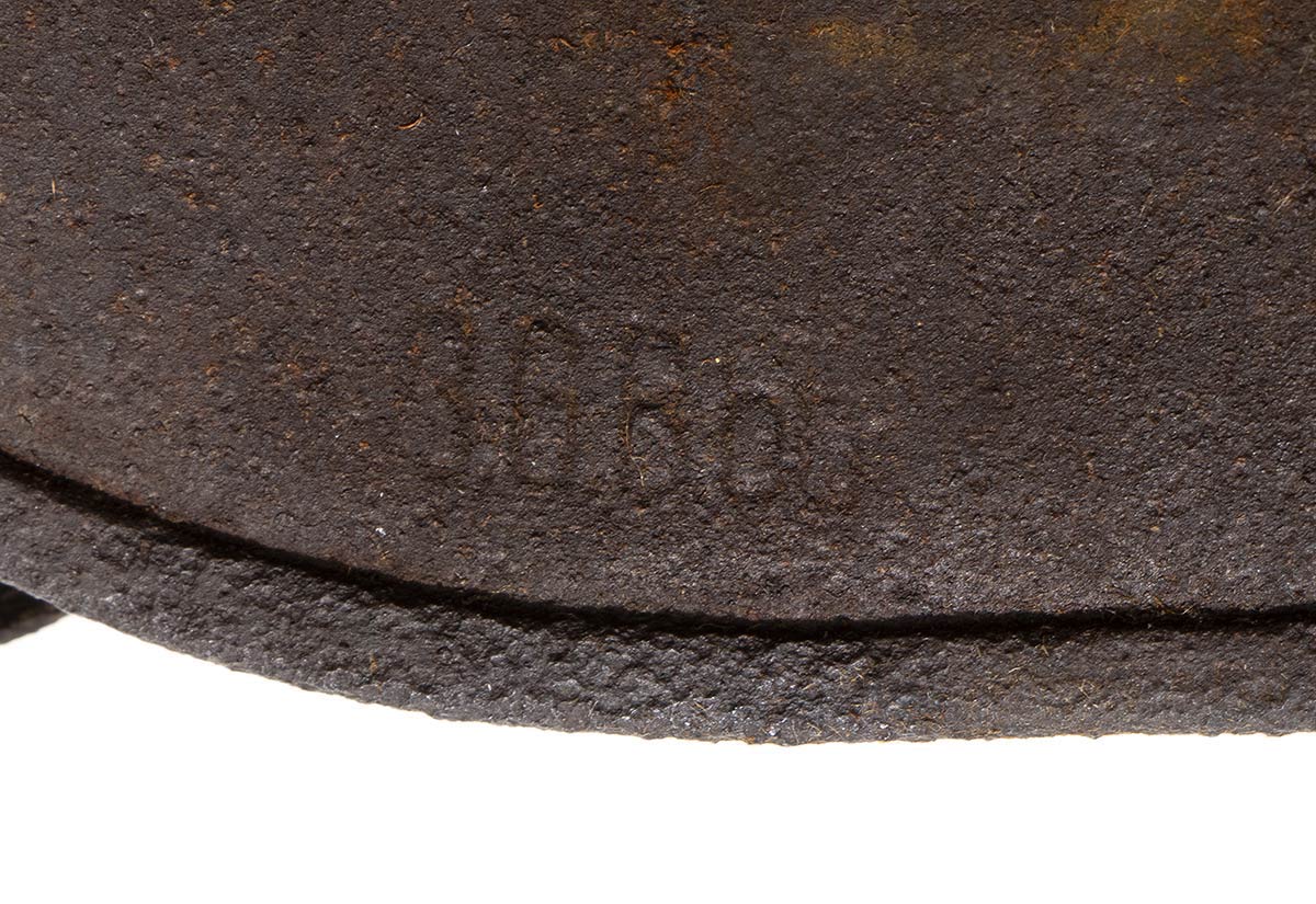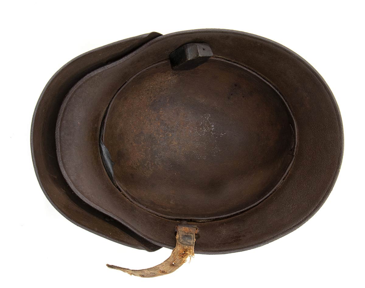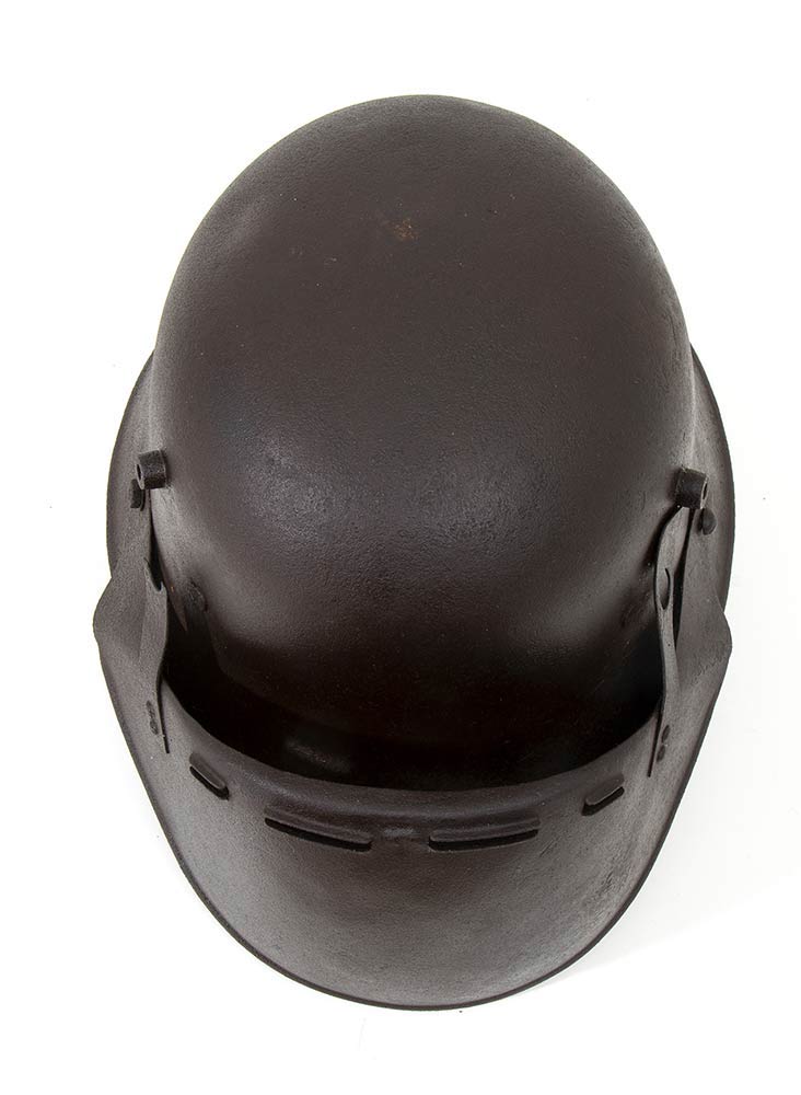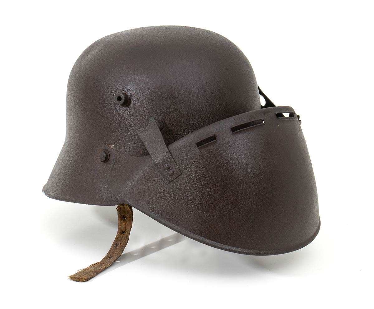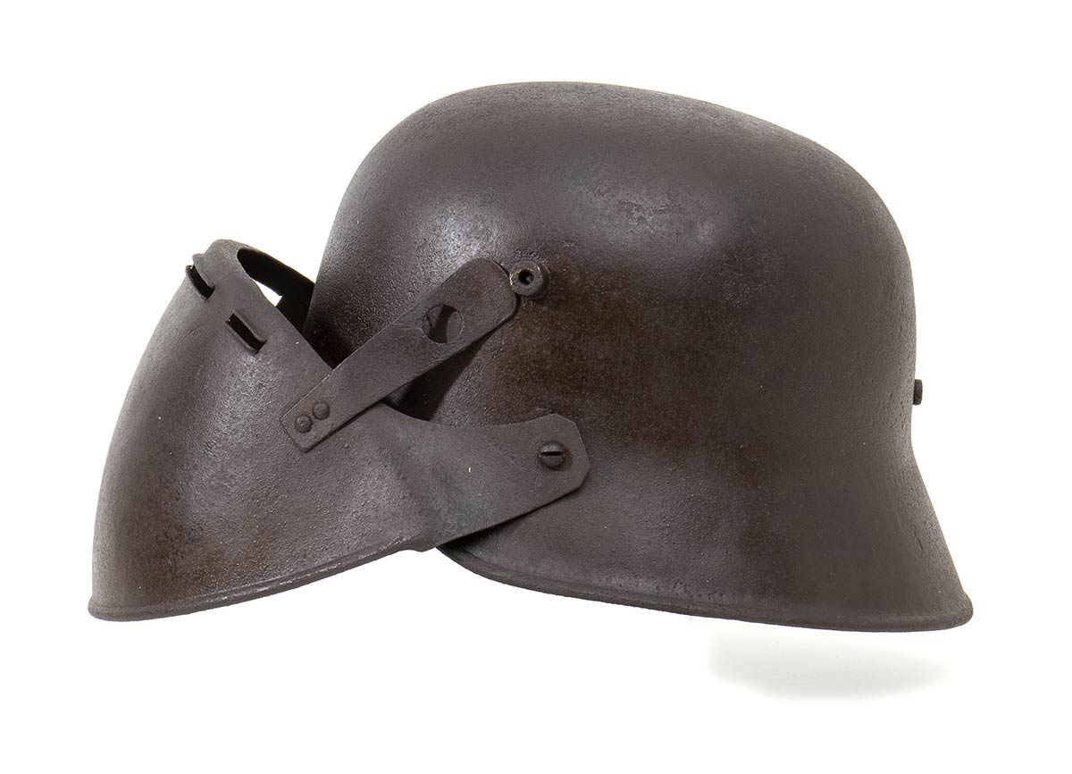 Rarissimo elmo m. 16 austriaco con celata antischegge, l'elmo si presenta con una ossidazione diffusa non penetrante e di colore compatto su tutto il corpo dell'elmo e della celata, privo dell'interno, strappato, e con parte di soggolo, la celata è applicata all'elmo con due ganci, di cui uno rotto,fissati agli aeratori, in questo caso non numerati, e due viti a testa tonda. L'ossidazione risulta superficiale, all'interno si vede la presenza della vernice che, dopo attenta pulizia, dovrebbe affiorare in buona percentuale su tutto l'elmo che è punzonato alla falda B.G.B.