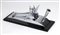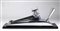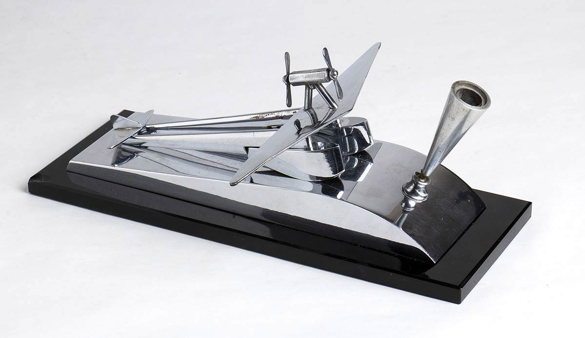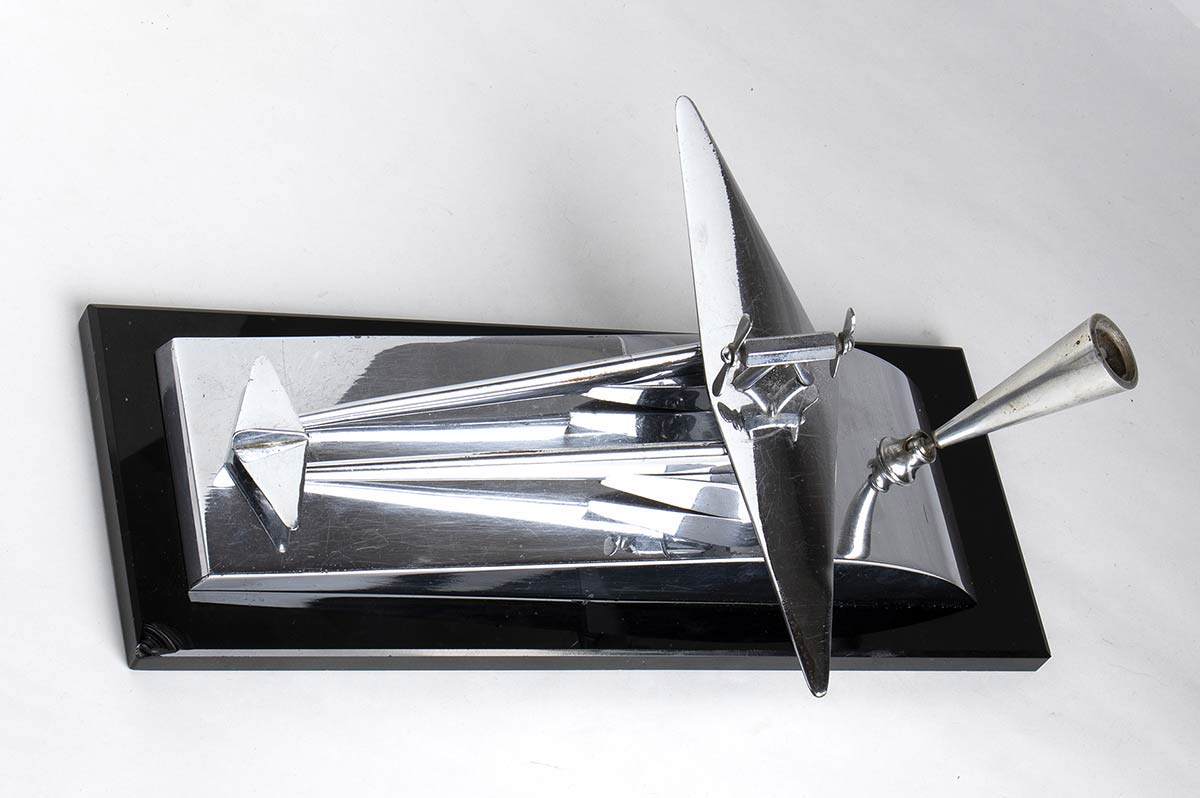 Bellissimo portapenne in metallo cromato di stile futurista, in forma di idroviolantes. 55, seppur molto stilizzato,in metallo cromato montato su vetro nero, lunghezza alla base cm 26