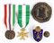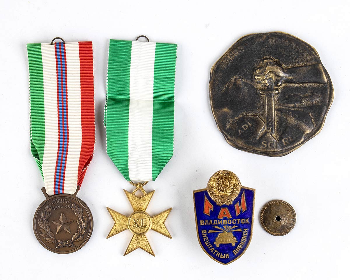 lotto di due medaglie post belliche, un distintivo sovietico, una grande medaglia in fusione delle camicie nere in Africa ed una scatola in marocchino verde con impressioni in oro.