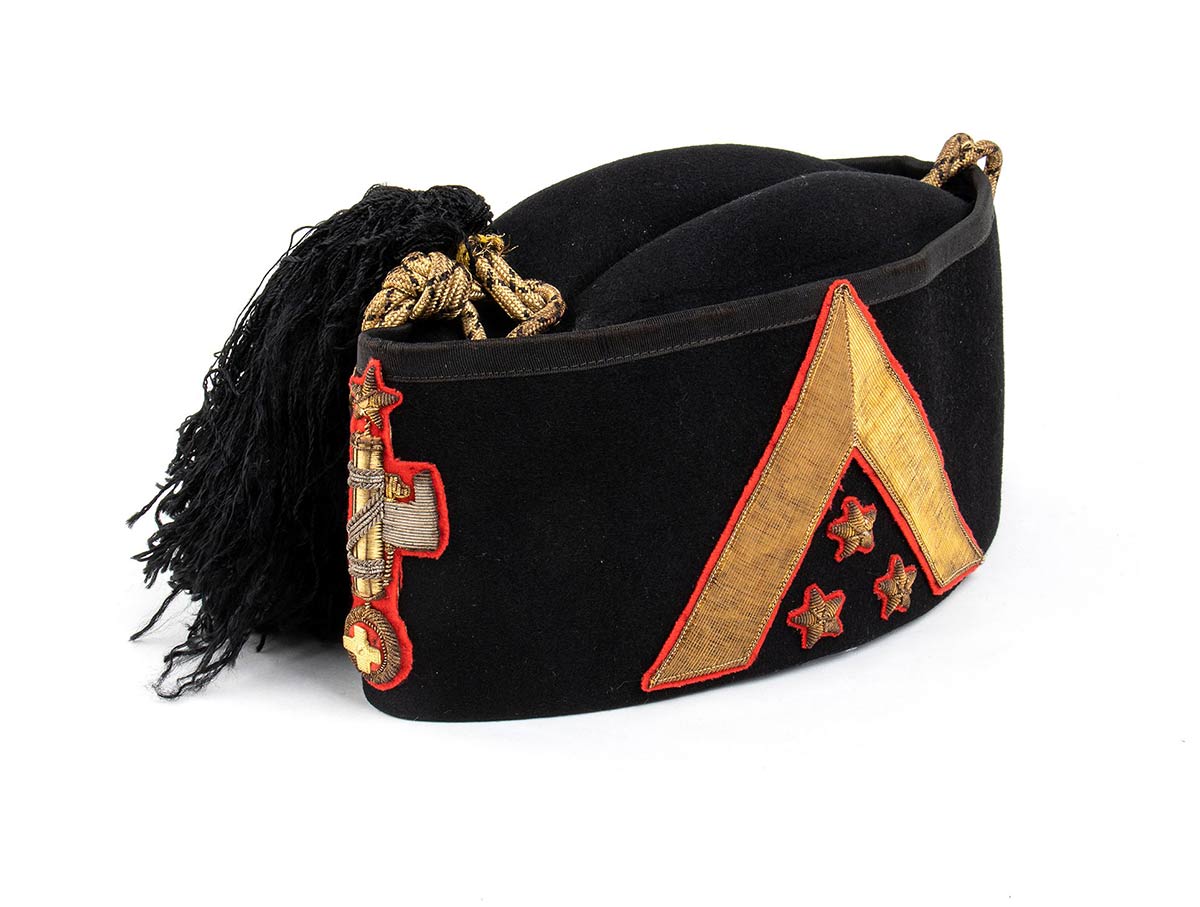 Bellissimo fez a busta m.31 da console comandante fuori corpo, fregio in canottiglia, fiocco di seta applicato anteriormente, ngrado a lastra con tre stelle oro su fondo scarlatto