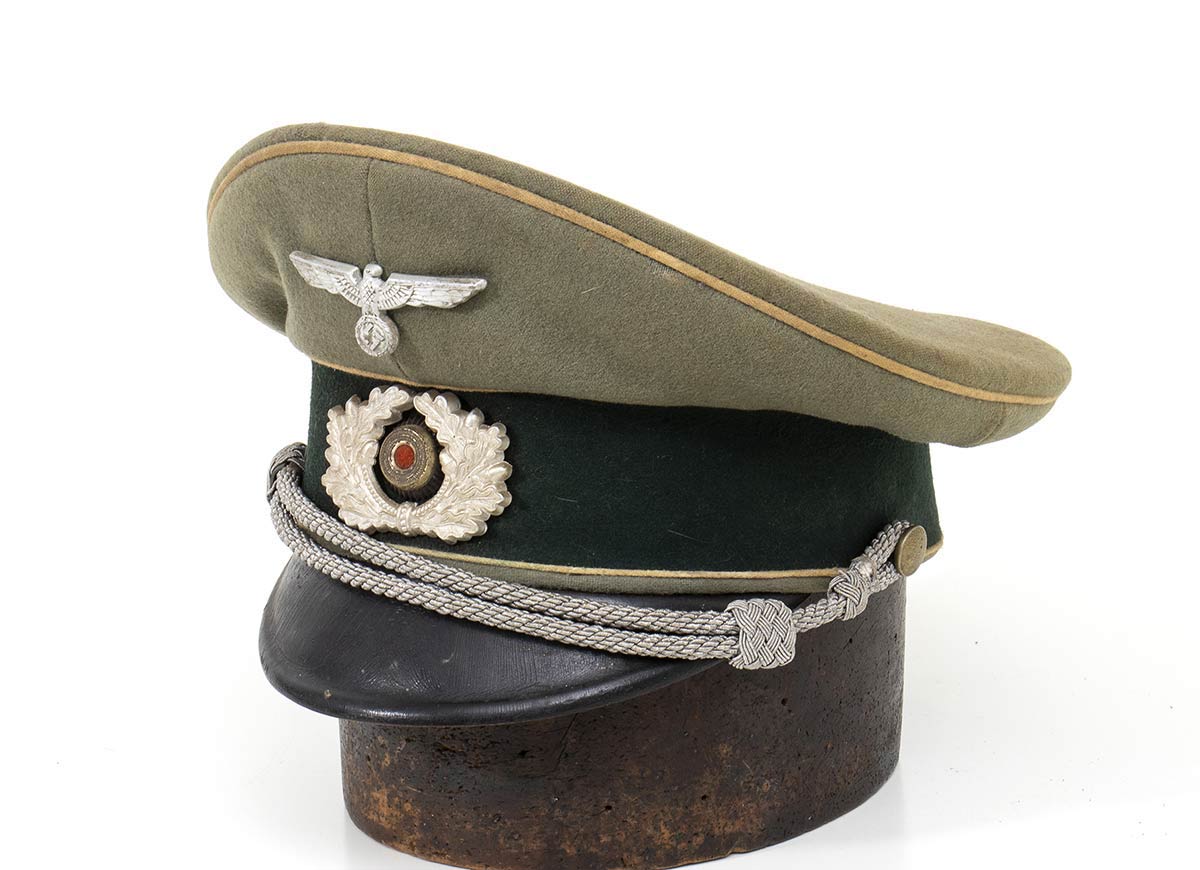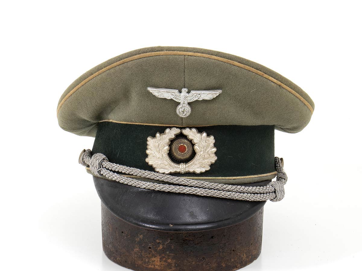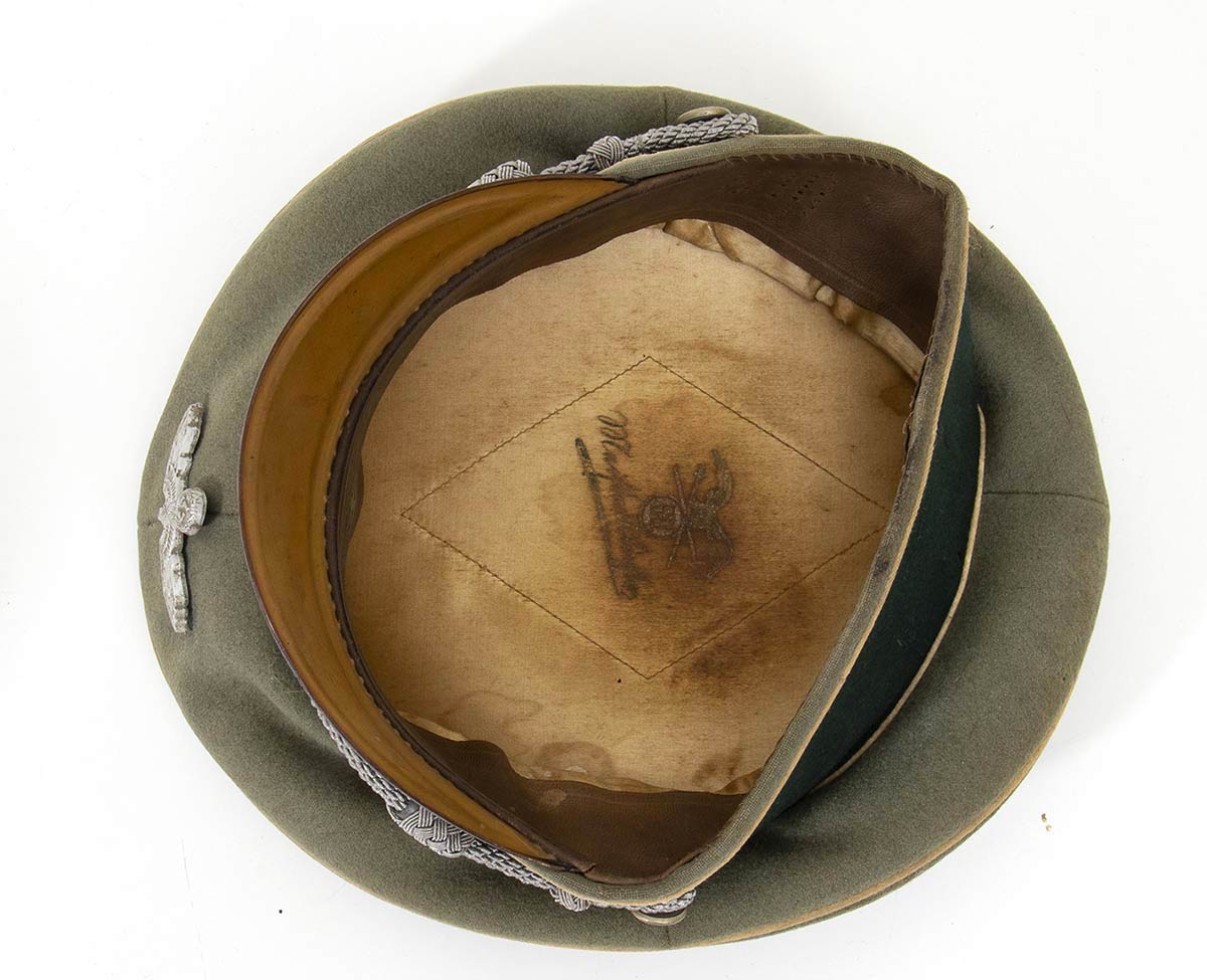 Berretto feldgrau profilato di bianco, tamburo di panno verde scuro, cordone a doppio tubolare metallico, interno in seta con marchi di fabbrica. buono stato