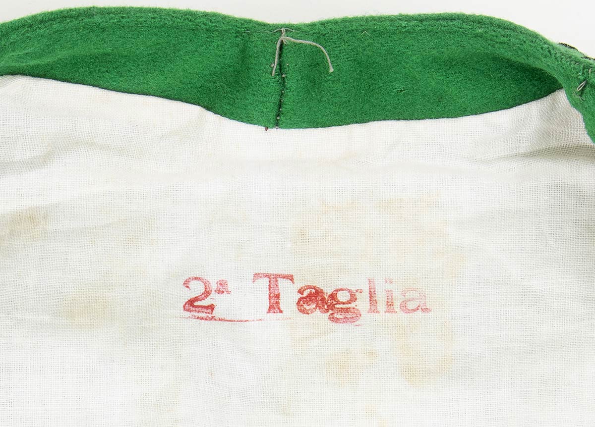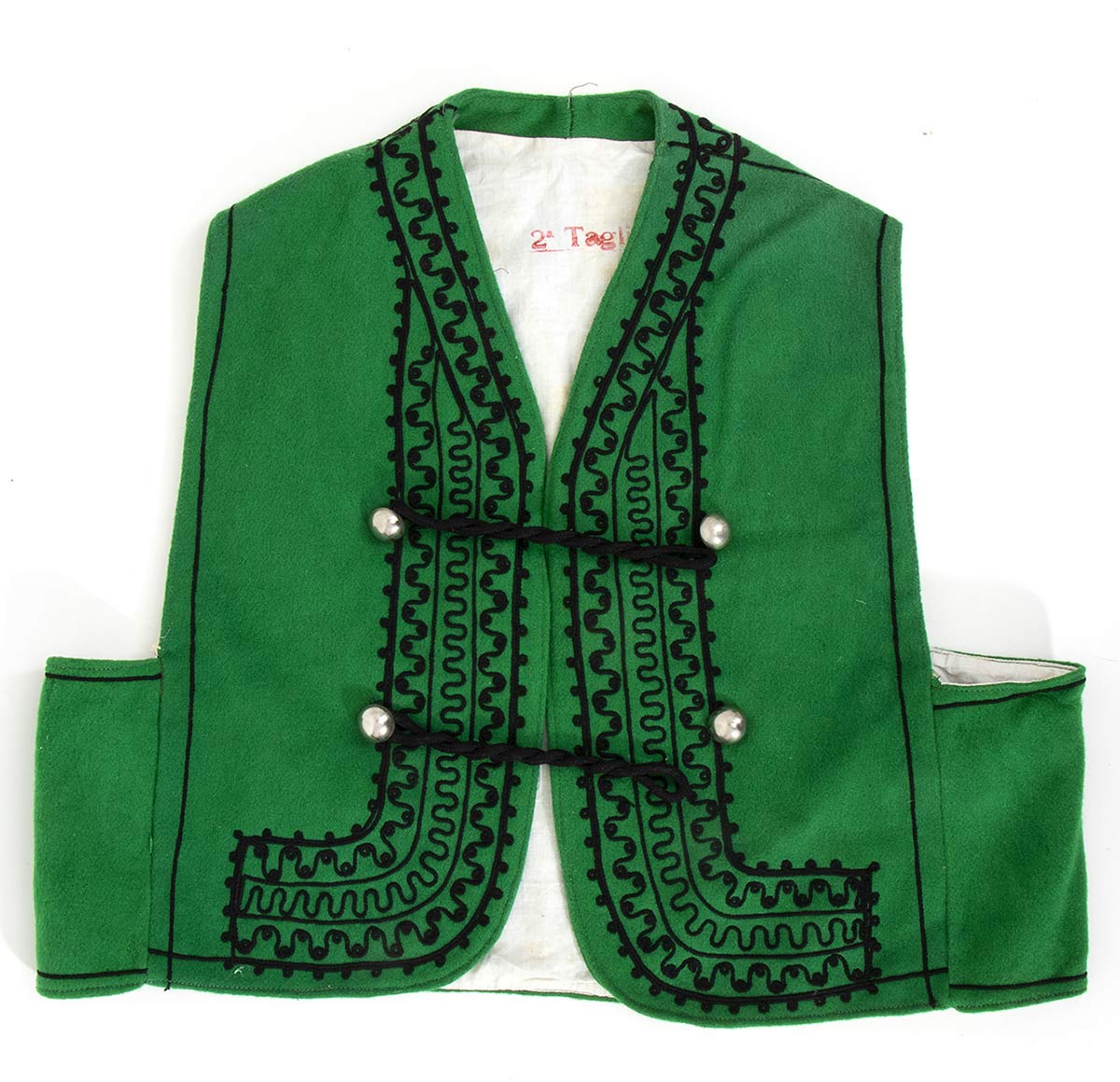 Bellissima farmula in panno di lana verde con ricami di cotone nero, bottoni a mezza palla in metallo argentato con alamari neri, interno di cotone bianco con numero di taglia, ottimo stato