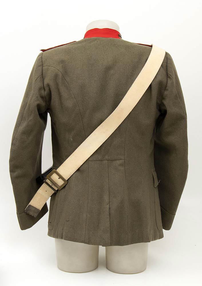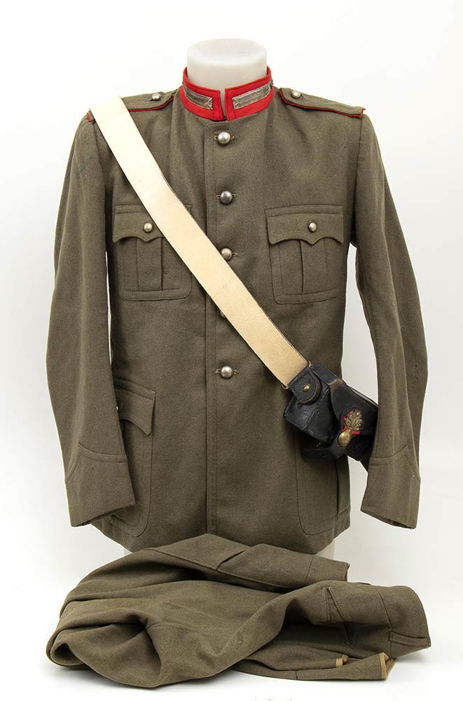 Particolare uniforme da carabiniere in servizio nelle isole del Dodecaneso e Creta, in lana caki con collo di panno scarlatto caricato di alamari argento, controspalline semifisse con filettatura rossa, pantaloni di lana e bandoliera di servizio. Ottimo stato