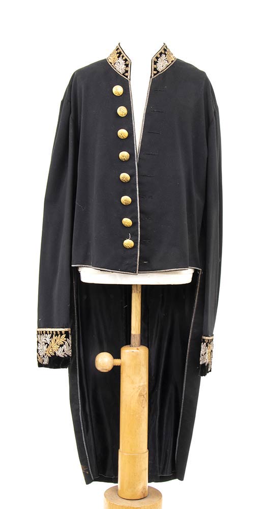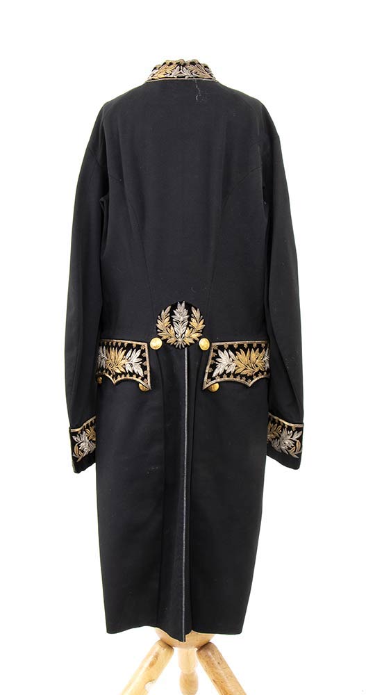 Antica giacca in fine panno di lana con ricami al collo, paramani ed alla falda di canottiglia oro ed argento, collo molto basso di stampo tipicamente ottocentesco. Discreto stato