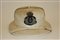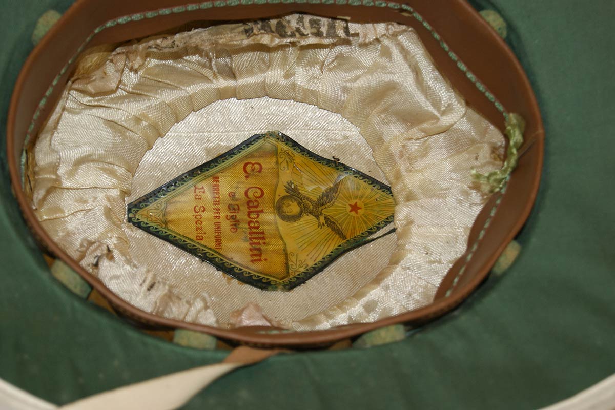 Sughero foderato di cotone bianco con applicato fregio della regia Marina con corona con tocco rosso ricamato in canottiglia dorata, all’interno marchio del fabbricante