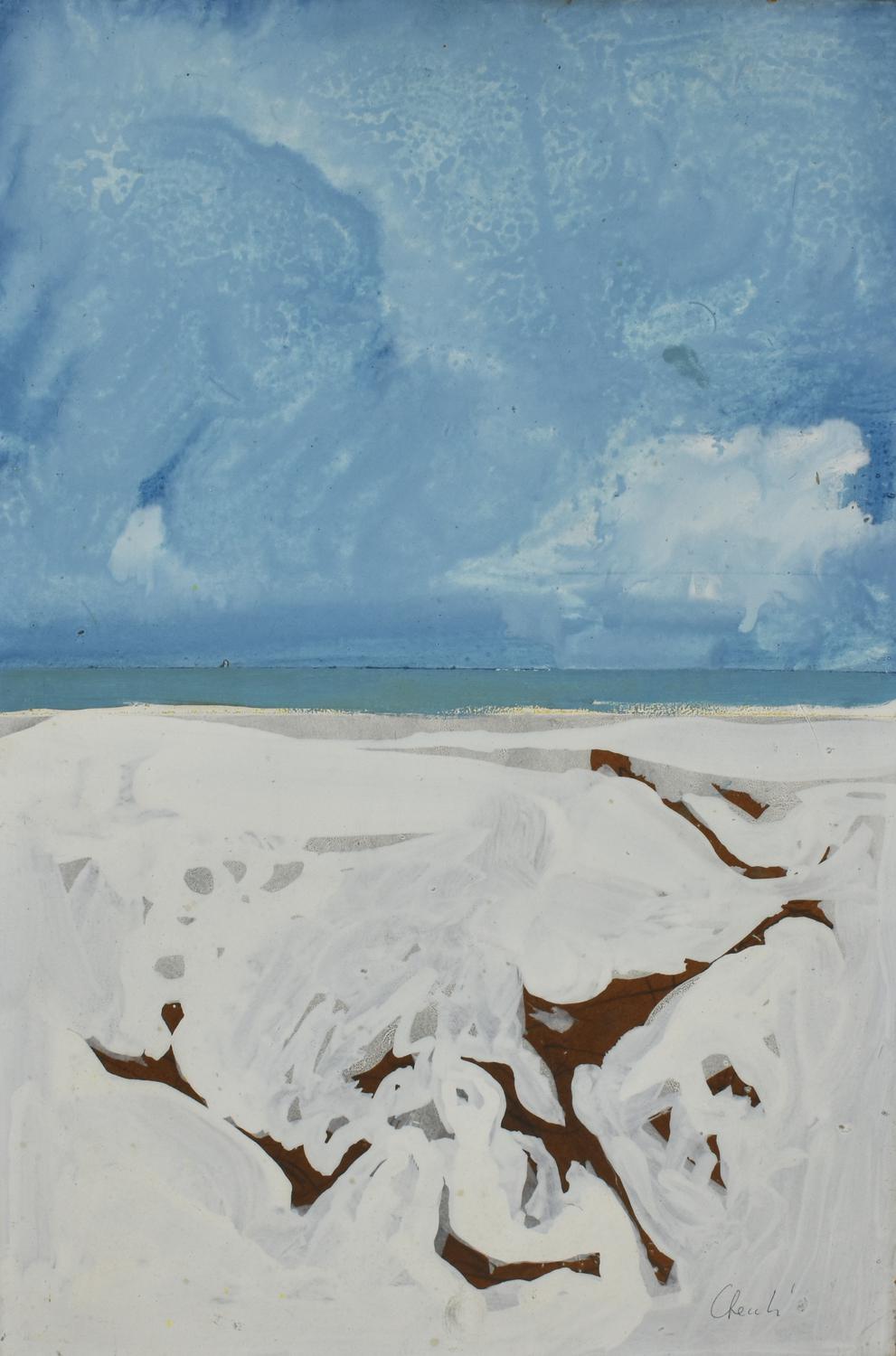 Giovanni Checchi SPIAGGIA tempera su masonite, cm 60x40 firma sul retro: titolo