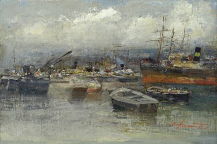 Ezzelino Briante (Napoli, 1901 - 1971) Barche al porto Olio su tela riportata su cartone, cm. 28x42,5 Firma in basso a destra.