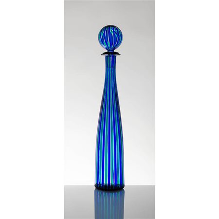 Grande bottiglia in vetro con decoro a canne alternate nei toni nel blu e del verde, 1984.