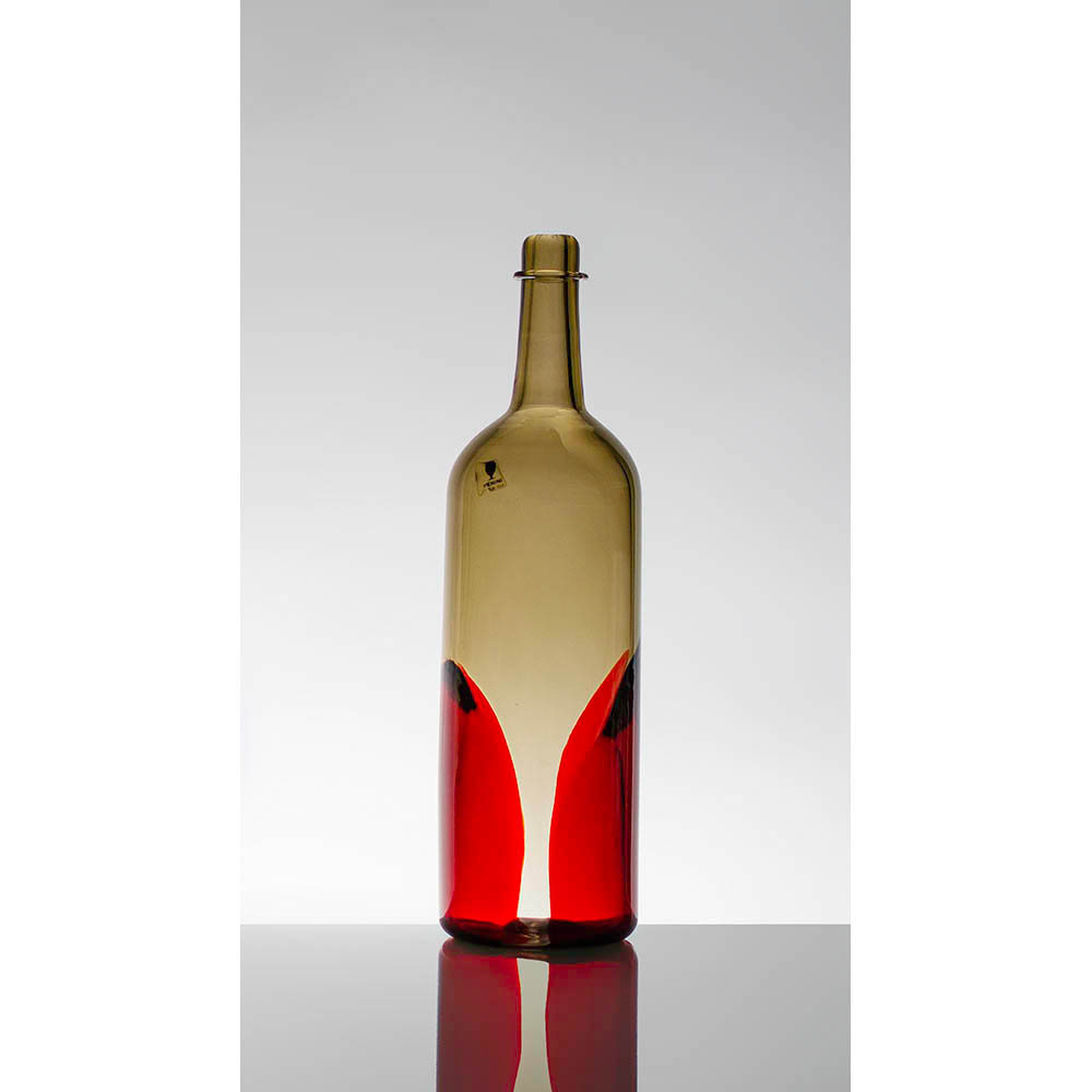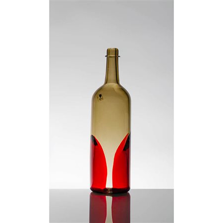 Bottiglia della serie “Pavoni” in vetro talpa con decorazione a macchie rosse, 1982.