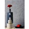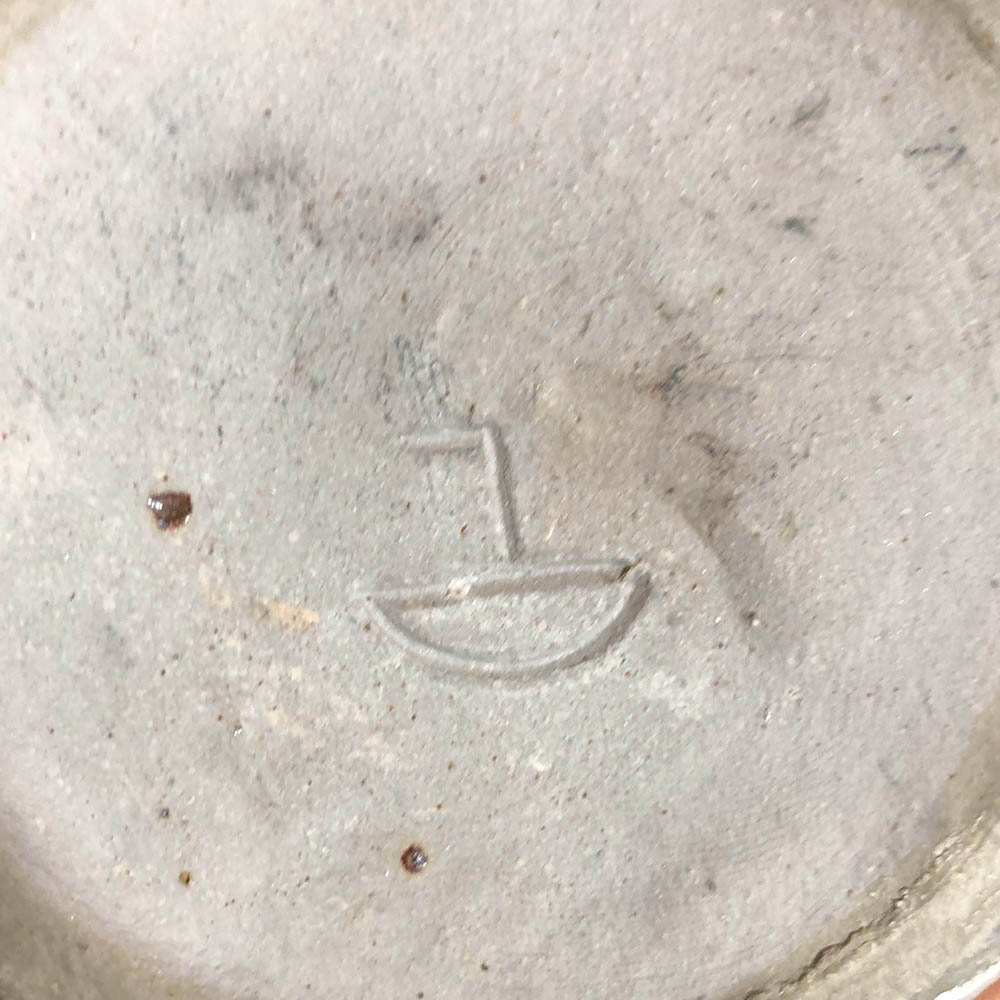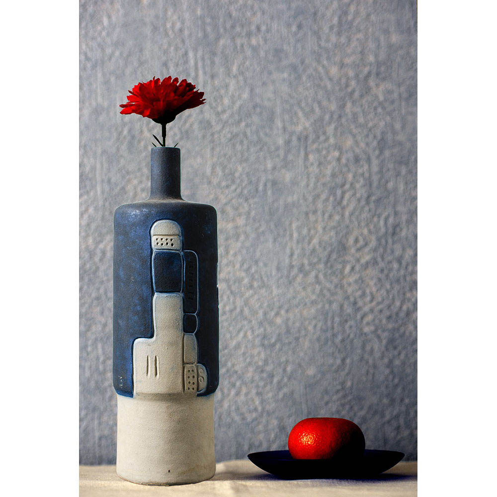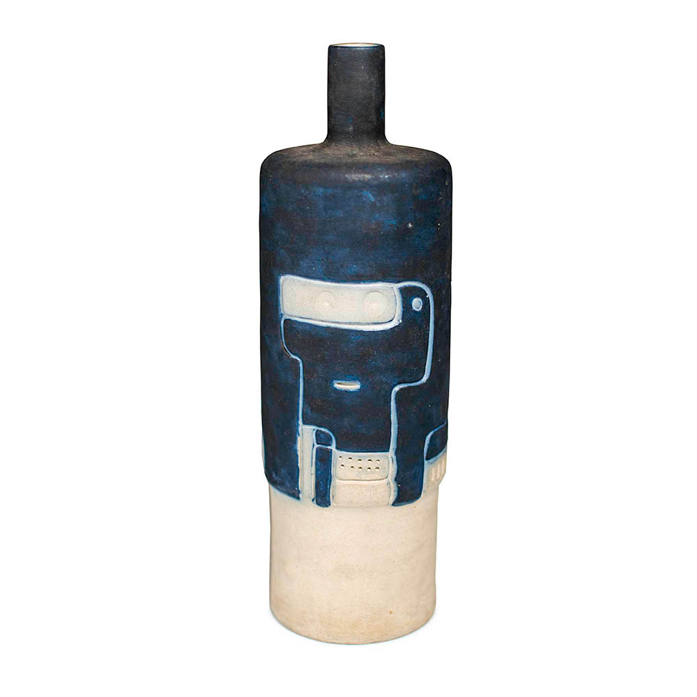 Vaso in ceramica nei toni del bianco e del blu con decorazione geometrica incisa, anni ‘70.