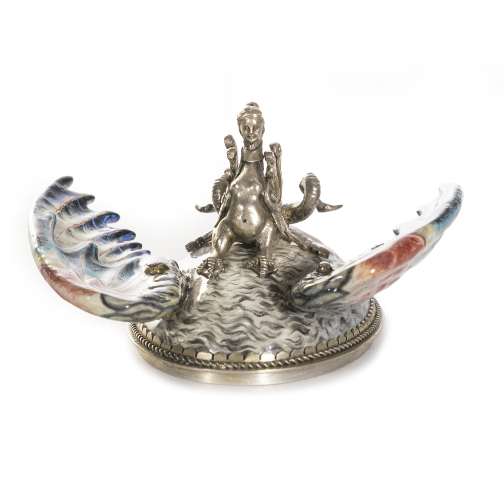 A silver cake holder in the shape of a fantastic animal, resting on an oval base with set stones, body finely decorated with enamel, molding on the lid represented by a silver harpy.